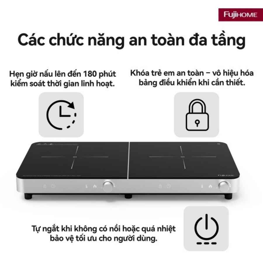- Bếp từ đôi Fujihome IC2602S không chỉ mạnh mẽ về hiệu năng mà còn được chú trọng tối đa về độ an toàn và độ tương thích. Sản phẩm đạt chuẩn EMC – đảm bảo tương thích điện từ, giúp bếp vận hành ổn định, không gây nhiễu đến các thiết bị điện tử xung quanh như tivi, tủ lạnh, loa…