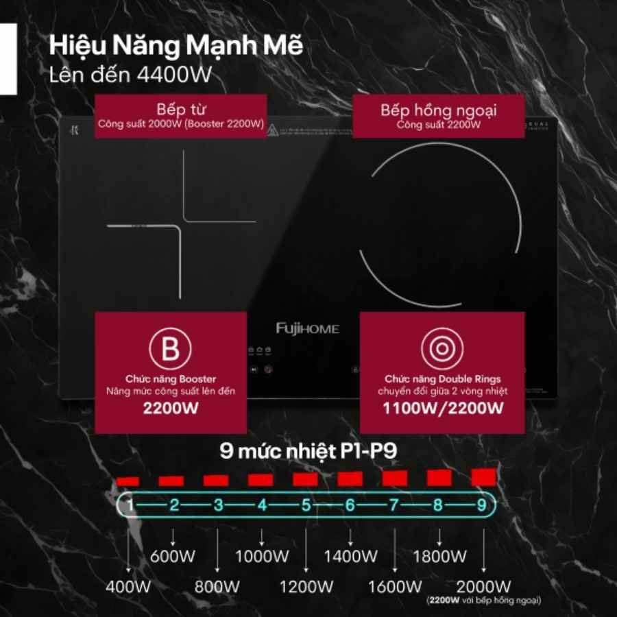 Bếp từ đôi và hồng ngoại Fujihome IC2519 sở hữu tổng công suất lên đến 4400W, mang đến khả năng nấu ăn mạnh mẽ và nhanh chóng. Vùng bếp từ bên trái có công suất 2000W, có thể tăng cường lên 2200W nhờ chức năng Booster siêu tốc. Vùng bếp hồng ngoại bên phải cũng đạt 2000W, tích hợp hai vòng nhiệt linh hoạt (1100W/2200W), phù hợp với nhiều kích thước nồi.