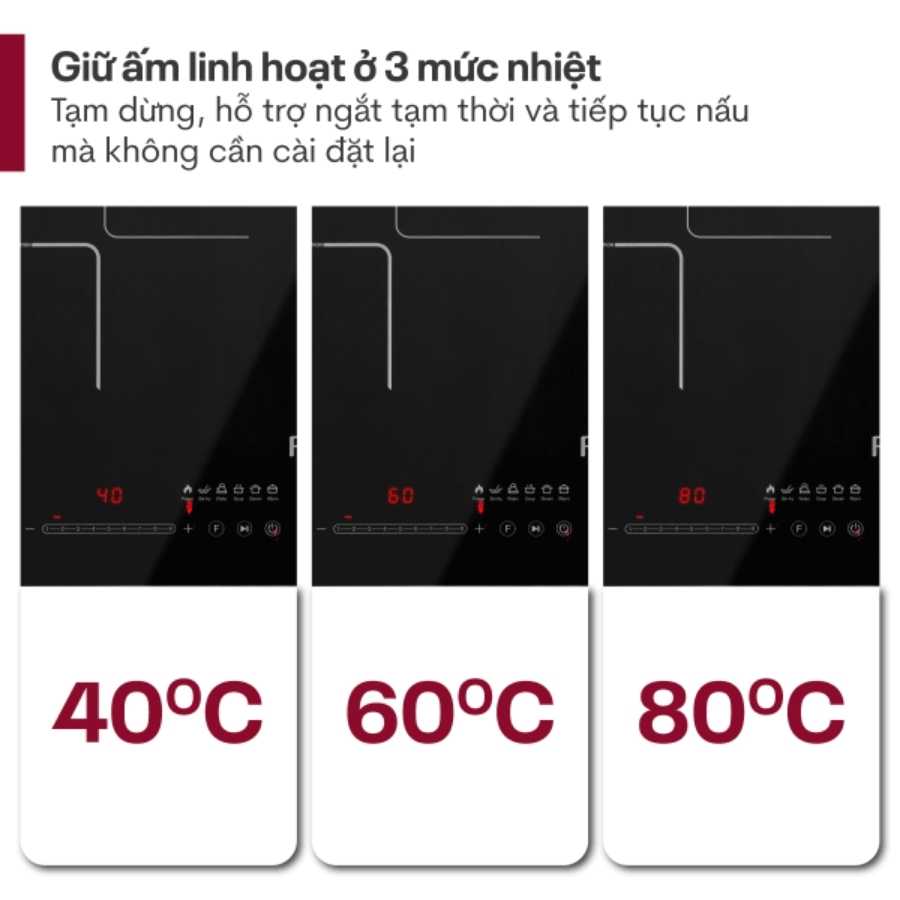 Fujihome IC2519 được tích hợp công nghệ Inverter hiện đại, cho phép gia nhiệt liên tục ở mức công suất thấp, giúp duy trì nhiệt độ ổn định, nấu ăn đều hơn và tiết kiệm điện năng đáng kể. Ngoài ra, bếp còn sở hữu chức năng giữ ấm tiện lợi với 3 mức nhiệt linh hoạt: 40°C – 60°C – 80°C, phù hợp cho từng loại món ăn.