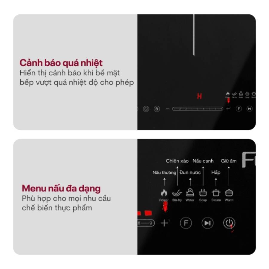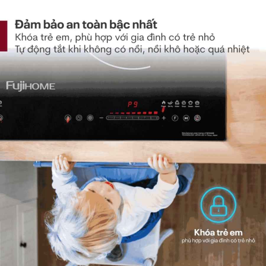 Fujihome IC2519 trang bị bảng điều khiển cảm ứng một chạm hiện đại, thao tác đơn giản và dễ dùng cho cả người lớn tuổi. Màn hình LED kỹ thuật số hiển thị rõ ràng mức công suất, thời gian nấu, cảnh báo lỗi và các thông số hoạt động, giúp người dùng theo dõi và điều chỉnh dễ dàng trong suốt quá trình nấu ăn.