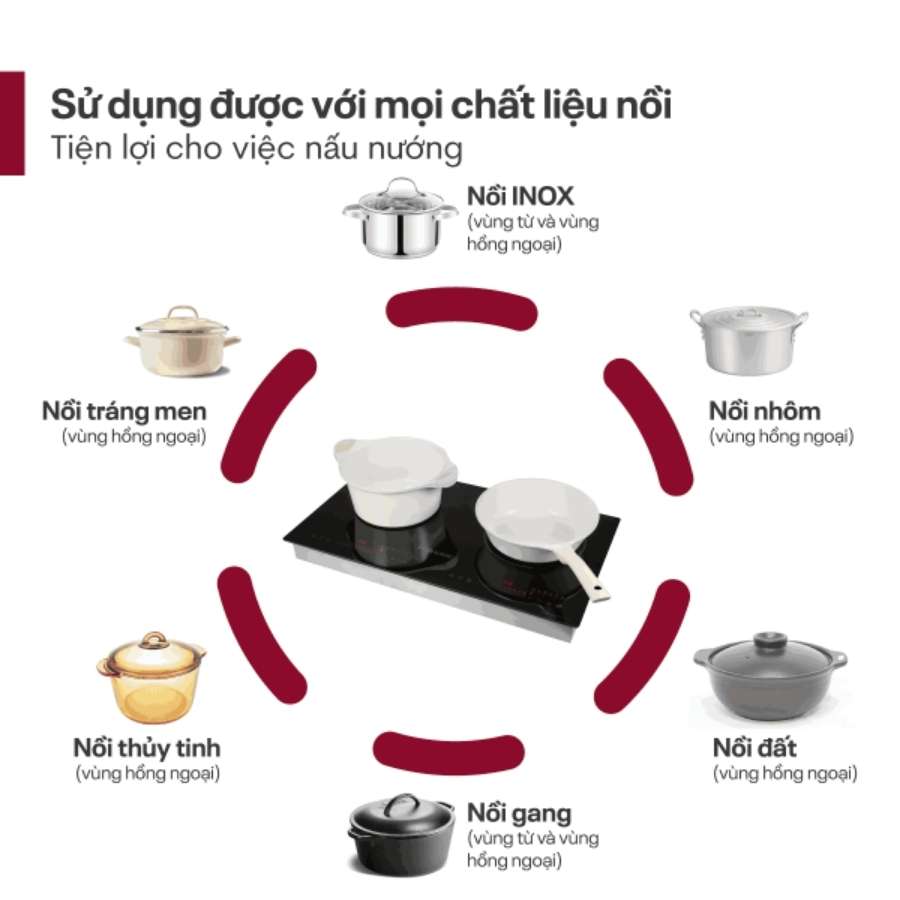 Chức năng Booster giúp bếp đạt nhiệt độ cao trong thời gian ngắn, rút ngắn đáng kể thời gian chế biến món ăn. Đặc biệt, vùng hồng ngoại không kén nối, có thể sử dụng với mọi chất liệu như inox, thủy tinh, gốm sứ hay nồi đáy mỏng, rất tiện lợi khi cần nấu các món truyền thống hoặc tận dụng các loại nồi sẵn có trong gia đình.
