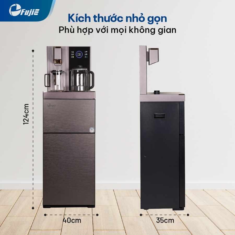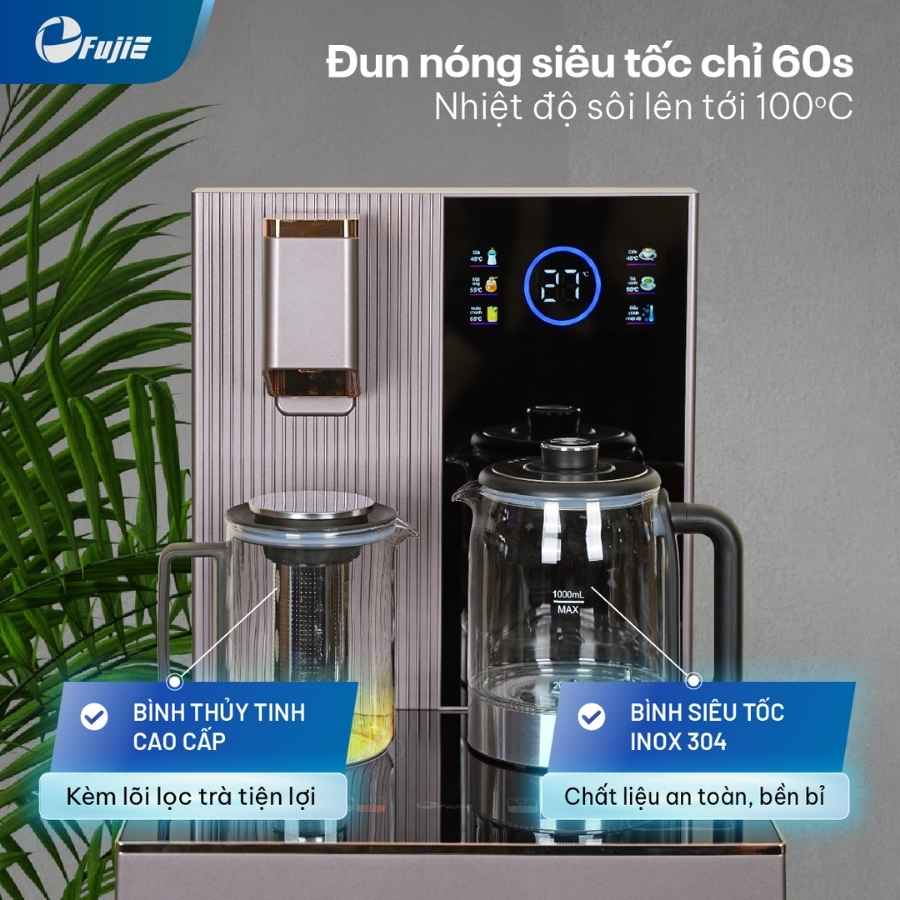 - FujiE TB238UV nổi bật với tông màu cà phê kết hợp viền mạ vàng tinh tế, tạo điểm nhấn đẳng cấp cho không gian. Mặt trên là kính cường lực cao cấp, kết hợp bảng điều khiển cảm ứng một chạm với màn hình hiển thị đa màu sắc, giúp người dùng dễ dàng theo dõi và lựa chọn nhiệt độ, chế độ nước cũng như các chức năng pha chế như trà, cà phê, nước ấm hay nước sôi.