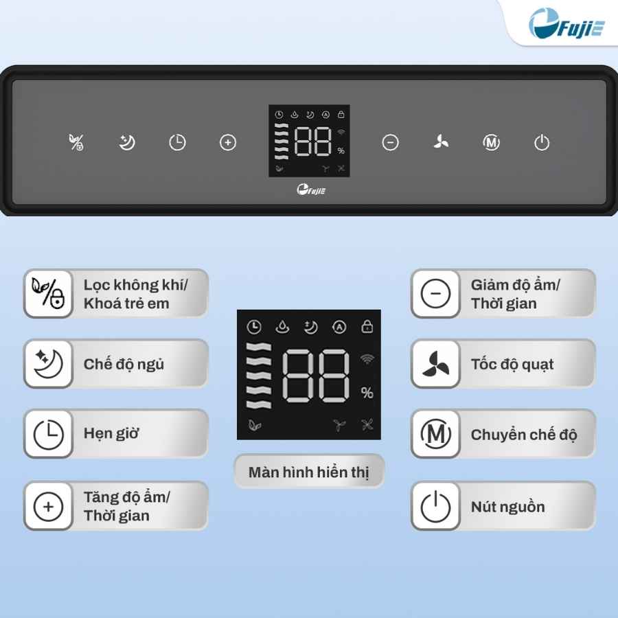 - Phía trước máy là màn hình LED sắc nét hiển thị đầy đủ thông tin như mức độ ẩm hiện tại, chế độ hoạt động và các tính năng cài đặt. Bảng điều khiển cảm ứng thông minh, bố cục hợp lý, dễ thao tác cho mọi đối tượng người dùng.