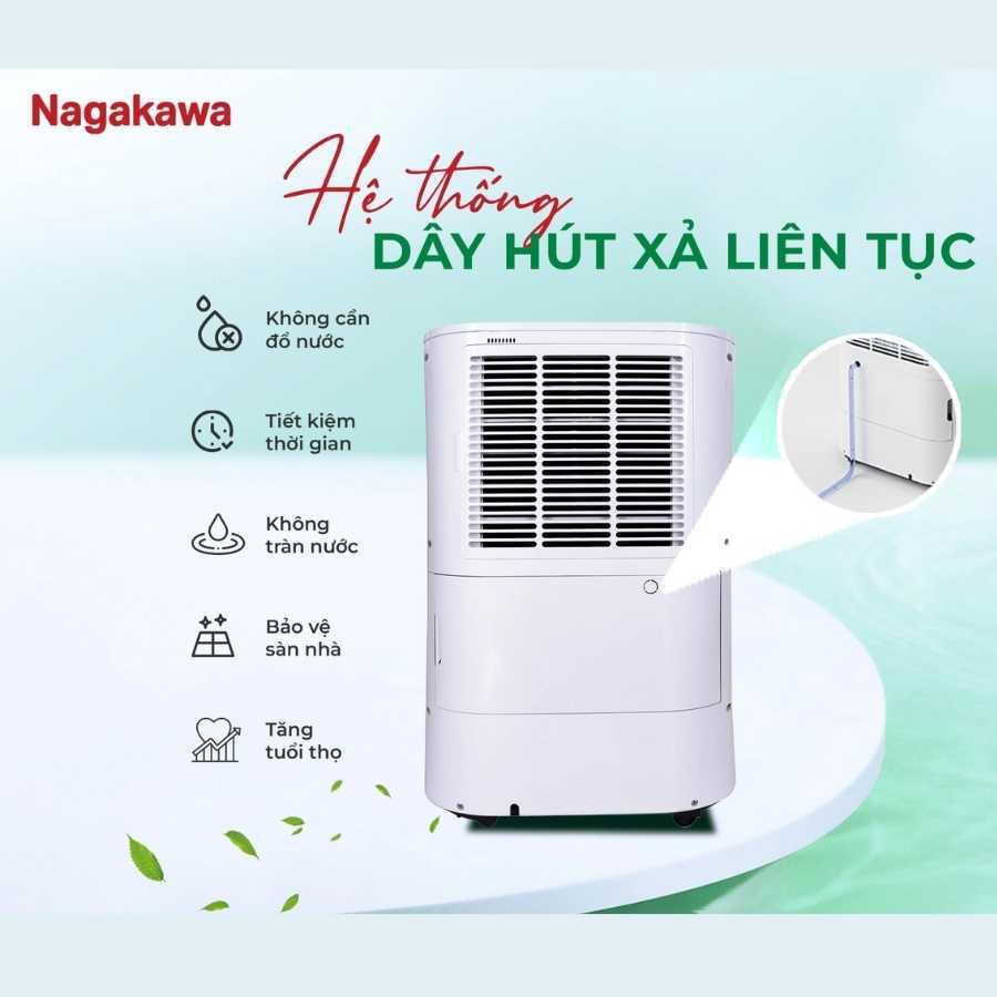 - Bạn đã bao giờ cảm thấy phiền phức khi phải thường xuyên đổ nước từ bình chứa của máy hút ẩm? Nagakawa NAD8569 sẽ giải quyết hoàn toàn vấn đề này! Máy được tích hợp hệ thống xả thải liên tục, cho phép máy hoạt động liên tục mà không cần dừng lại đổ nước.