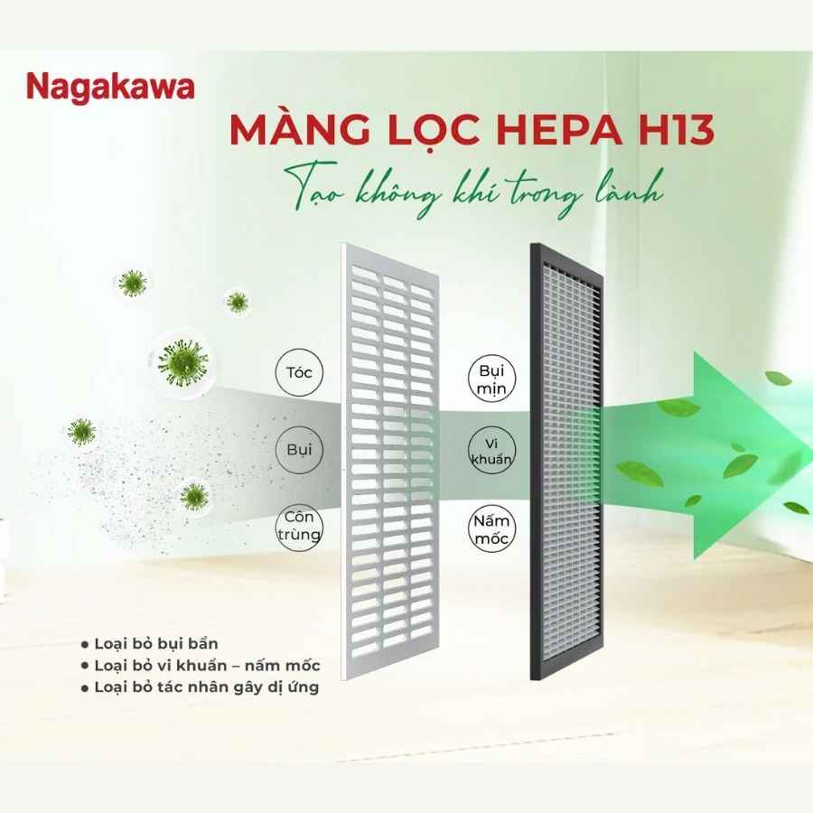 Không chỉ hút ẩm, Nagakawa NAD8569 còn được trang bị màng lọc HEPA H13 bụi bẩn, vi khuẩn, nấm mốc và các tác nhân gây dị ứng. Màng lọc này có khả năng loại bỏ tối đa các hạt bụi có kích thước siêu nhỏ, mang đến bầu không khí trong lành, tinh khiết, bảo vệ sức khỏe hô hấp cho cả gia đình.