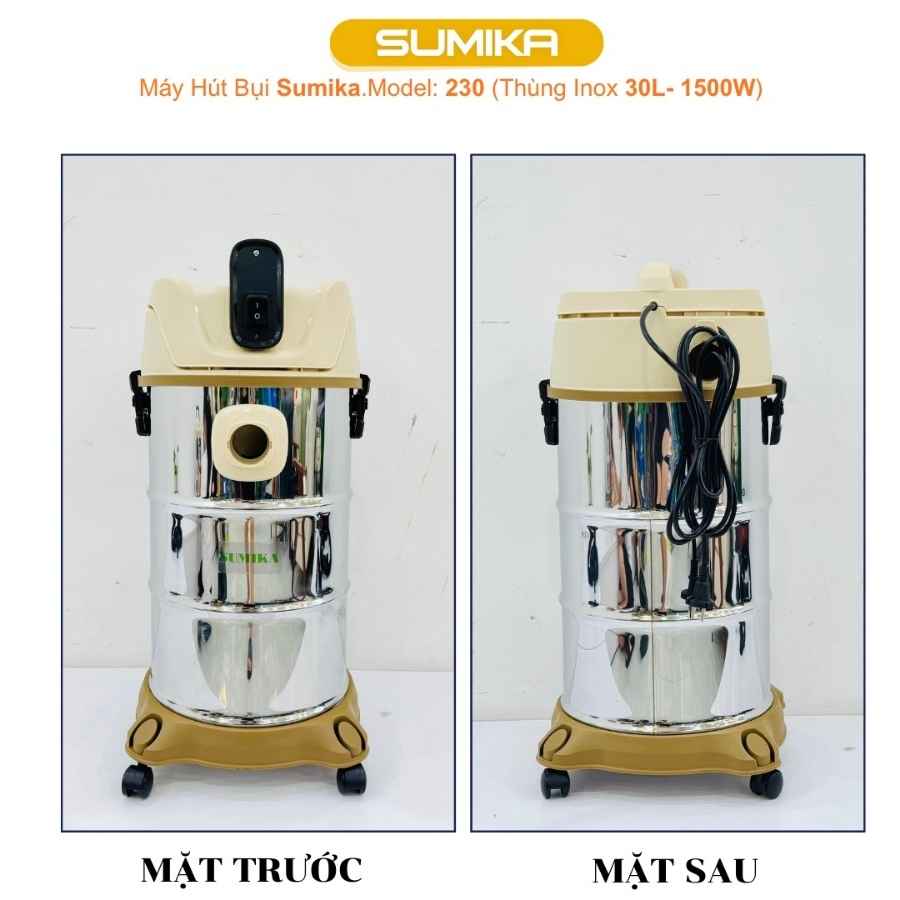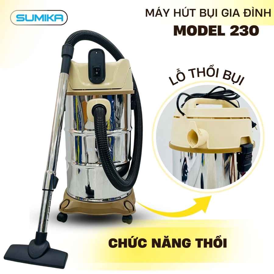 Máy hút bụi gia đình SUMIKA 230, công suất 1500W, thùng chứa 30L là phương tiện vệ sinh tiện dụng cho văn phòng, công ty, nhà xưởng nhỏ, cửa hàng cũng như gia đình. Đối với những không gian quá rộng hoặc khó lau chùi thì một chiếc máy hút bụi luôn phát huy tối đa tính khả dụng của mình.