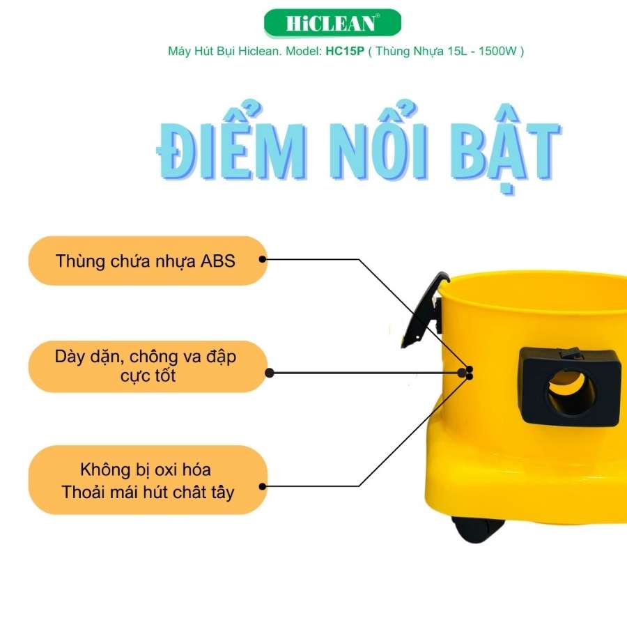 - Máy hút bụi HICLEAN HC15P được thiết kế với kiểu dáng nhỏ gọn, dễ dàng di chuyển và sử dụng. Với thiết kế 2 bánh xe.