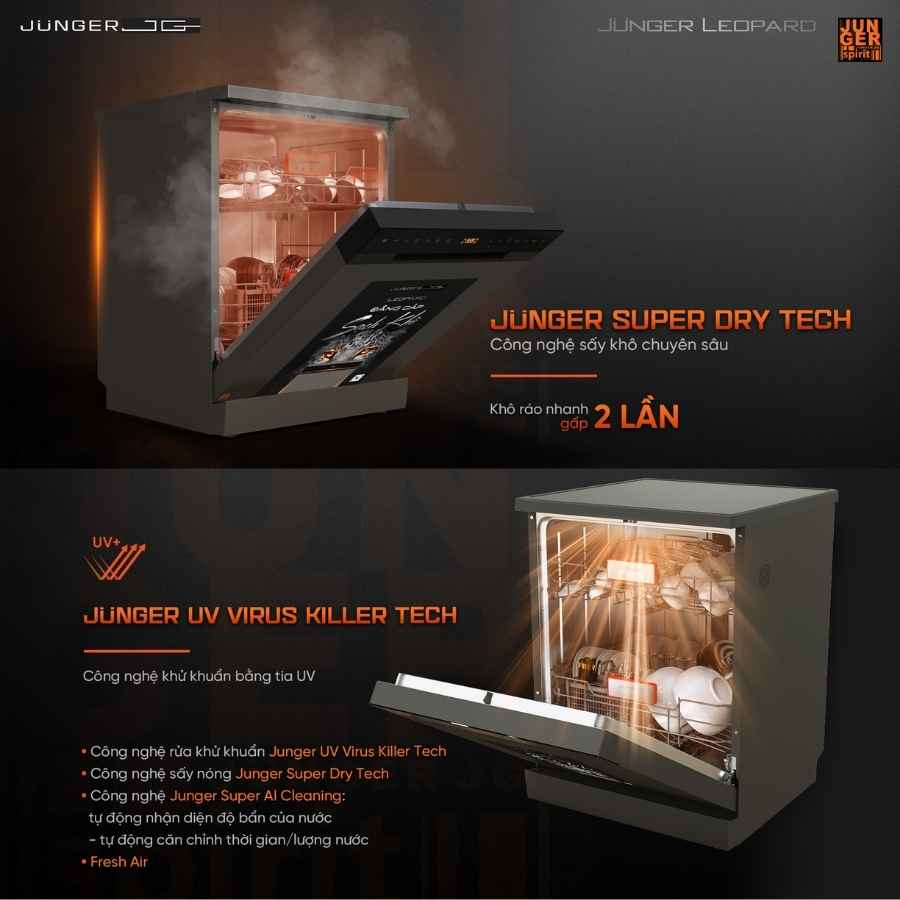 Máy rửa bát Junger Leopard DWJ-163-MS được trang bị 7 công nghệ hiện đại chuẩn Đức, nổi bật: