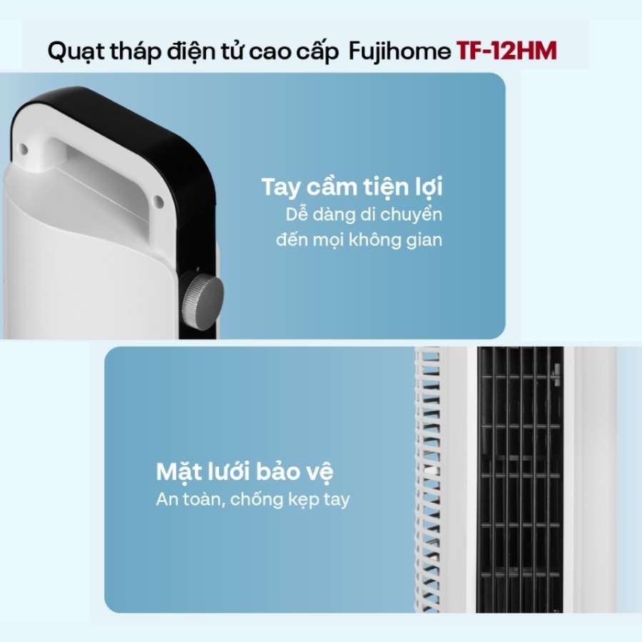 - Quạt tháp Fujihome TF-12HM có kiểu dáng không cánh sang trọng, an toàn