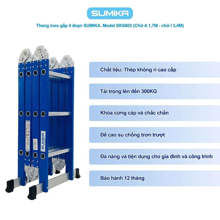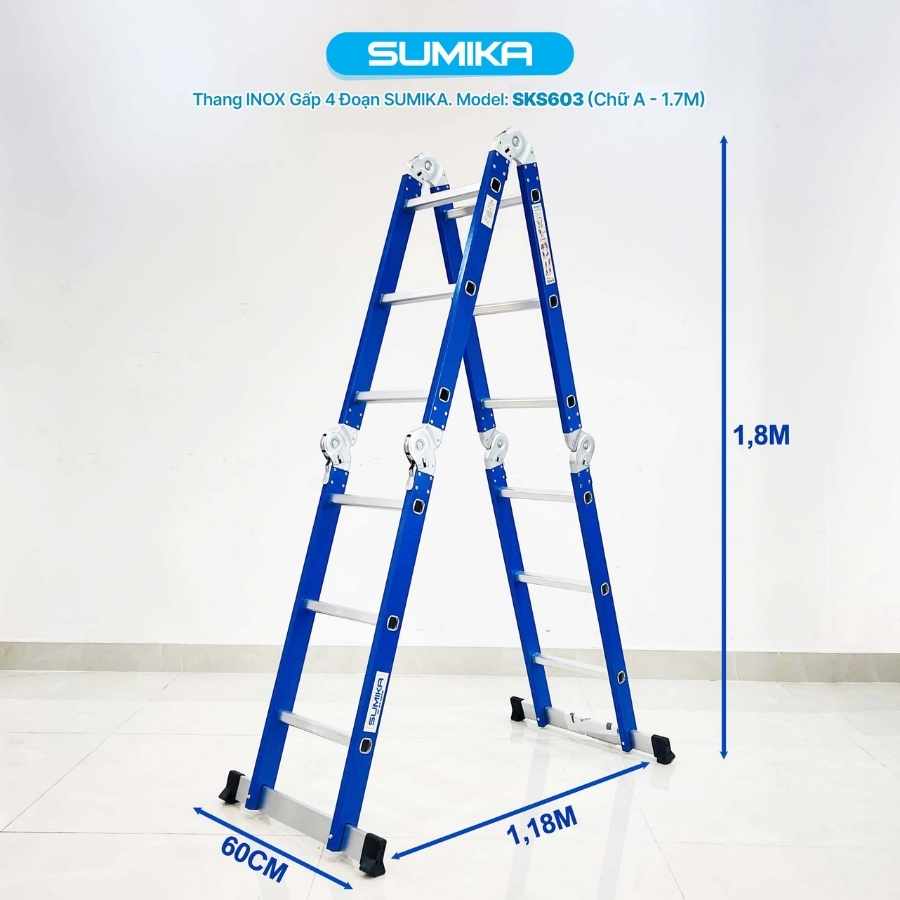 Thang inox gấp 4 đoạn Sumika SKS603, chữ A cao 1.7m, chữ I cao 3.4m