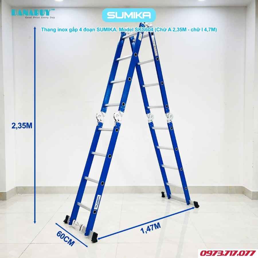 Thang inox gấp 4 đoạn Sumika SKS604, chữ A cao 2.35m, chữ I cao 4.7m