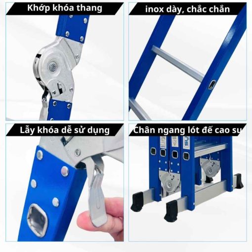 Khung thang được làm từ inox cao cấp chống gỉ sét, đảm bảo độ bền vượt trội khi sử dụng trong môi trường ẩm ướt hoặc ngoài trời. Kết cấu chắc chắn, bản lề khóa an toàn giúp thang luôn ổn định trong quá trình làm việc, mang lại cảm giác yên tâm cho người dùng.