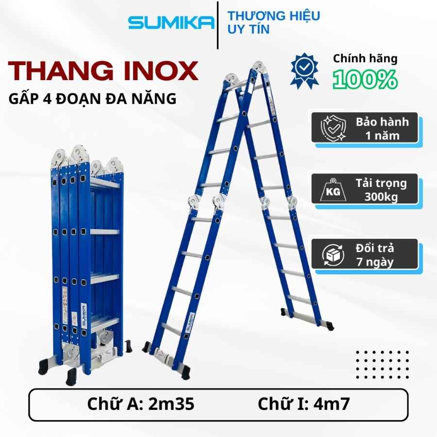 - Thang inox gấp 4 đoạn Sumika SKS604 có khả năng chuyển đổi dễ dàng giữa dạng chữ A cao 2.35m và dạng chữ I cao tối đa 4.7m, sản phẩm giúp người dùng tiếp cận các vị trí trên cao một cách an toàn và thuận tiện.